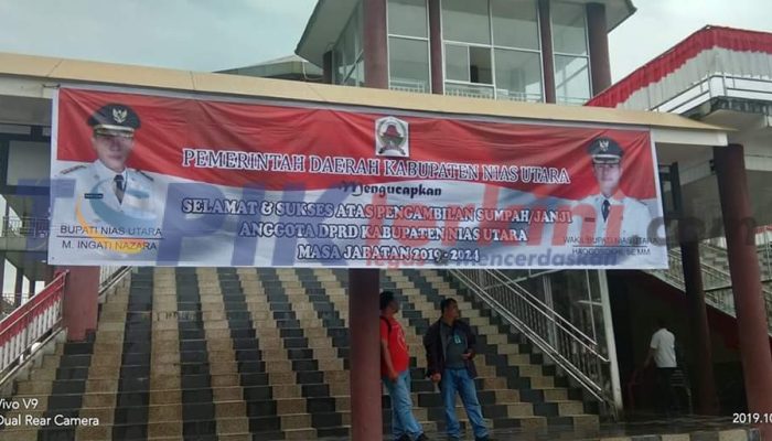 TOPIKTERKINI.COM-GUNUNGSITOLI-Sepaduk mengucapkan Selamat pengabilan sumpah dan janji DPRD yang dipajang didepan kantor DPRD Nias Utara, diduga marga wakil bupati dihilangkan