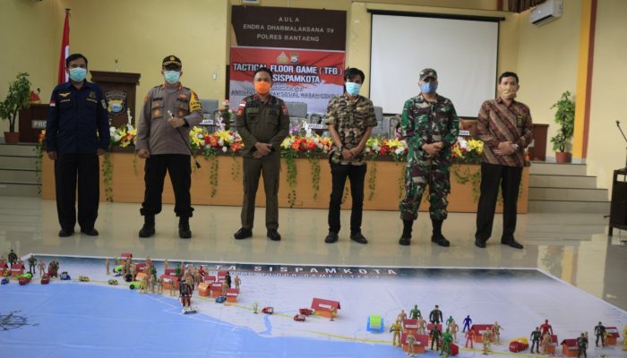 TOPIKTERKINI.COM–BANTAENG: Kapolres Bantaeng AKBP Wawan Squmantri pimpin Pelaksanaan kegiatan simulasi Sistem Pengamanan Kota (Sispamkota) dan Tactical Floor Game (TFG) Polres Bantaeng bersama unsur Forkopimda Kab. Bantaeng. di Aula Endra Dharmalaksana 99 Mapolres Bantaeng Jalan Sungai Bialo, Kamis 16/4/2020.