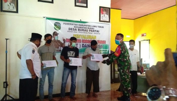 Koptu Ramin Ismail anggota Koramil 13/ Wotu jajaran Kodim 1403/Swg sebagai Babinsa wilayah Desa Burau Pantai, melaksanakan pemantauan pembagian BLT terdampak Covid19 dari Dana Desa (BLT-APBD) sebanyak 82 KK yang bertempat di aula Desa Pantai Burau. Hadir dalam kegiatan tersebut Kepala Desa, Perangkat, Ketua BPD beserta Anggota, Babinsa dan Babinkamtibmas.