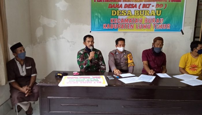 TOPIKTERKINI.COM, LUWU TIMUR – Babinsa Koramil 13/Wotu Kodim 1403/Swg, Pelda Askar menghadiri Penyaluran Dana BLT Dana Desa Burau Kecamatan Burau Luwu Timur, Minggu, (17/05/2020).