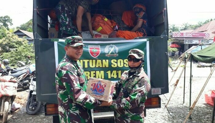 Bantuan dari personil yang dikomandoi Letkol Inf Richard M. Butar Butar disalurkan melalui posko kodim dan masyarakat terdampak banjir dan tanah longsor di Masamba, Sabtu(18/2020).