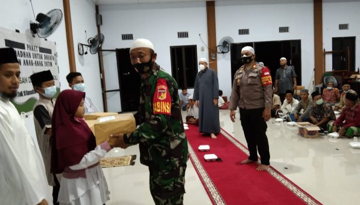 Babinsa Serda Nekad bersama Kapolsek Toili AKP Candra di dampingi Kepala Yayasan Darusunnah turut membagikan bingkisan sembako dan uang tunai ke 15 anak yatim.