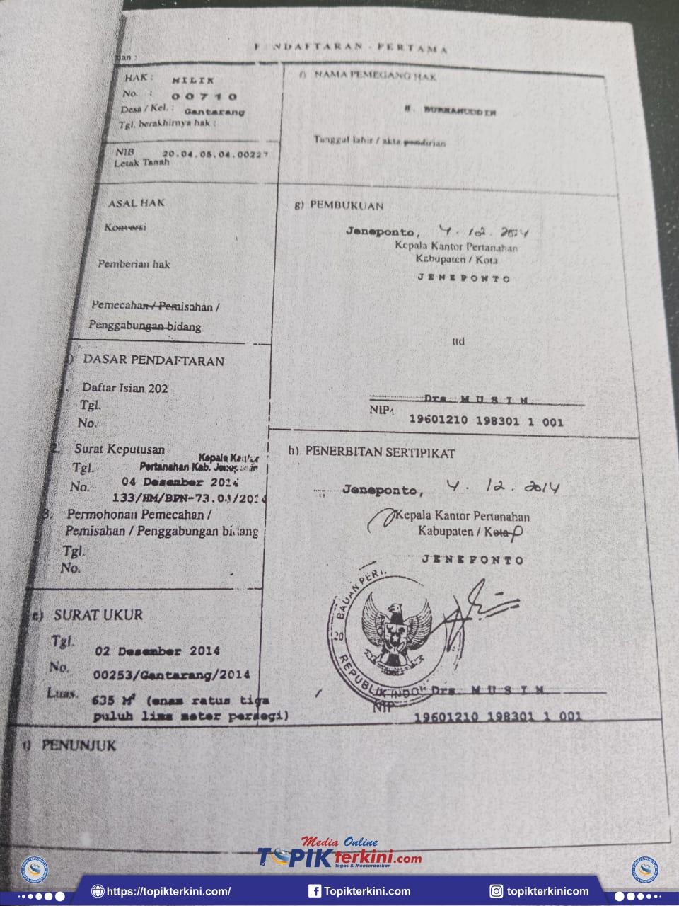 Masalah makin rumit ketika sertifikat tanah atas nama Burhanuddin ditemukan telah terbit pada tahun 2014. Nasir mengaku heran dan menduga ada praktik mafia tanah di BPN Jeneponto.