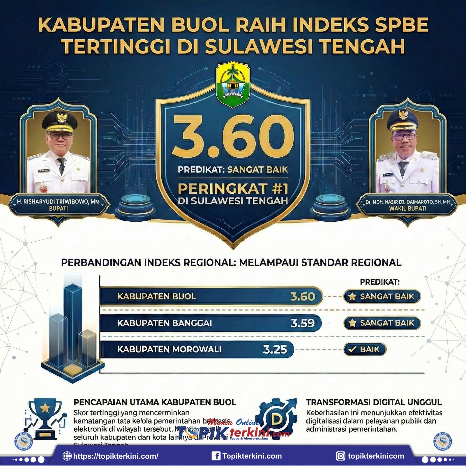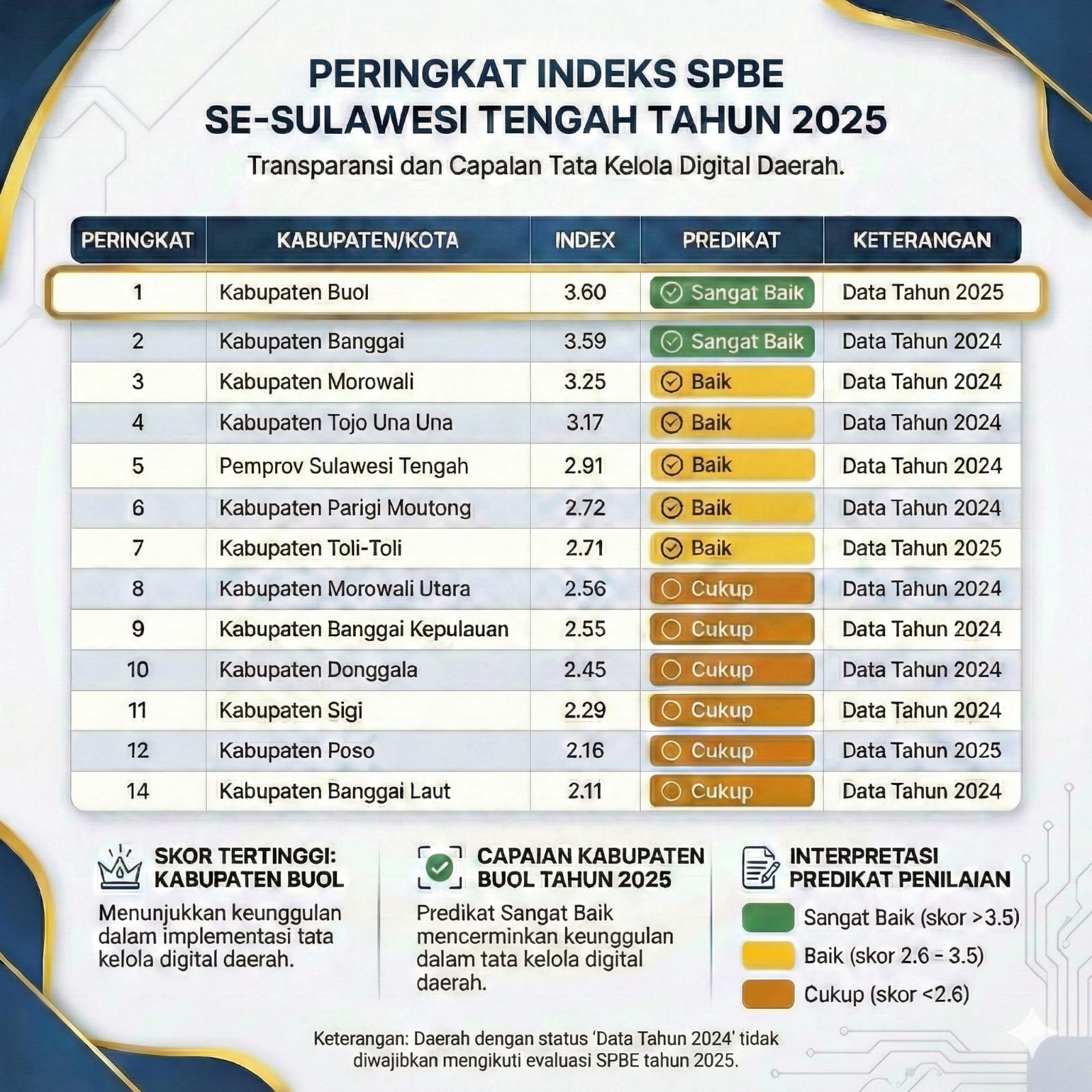 Topikterkini.com.|Palu – Tata kelola digital di Provinsi Sulawesi Tengah menunjukkan kemajuan signifikan pada tahun 2025. Berdasarkan rilis Peringkat Indeks Sistem Pemerintahan Berbasis Elektronik (SPBE), Kabupaten Buol berhasil menempati posisi tertinggi dengan skor 3,60 dan predikat Sangat Baik, mengungguli seluruh kabupaten/kota di wilayah tersebut.