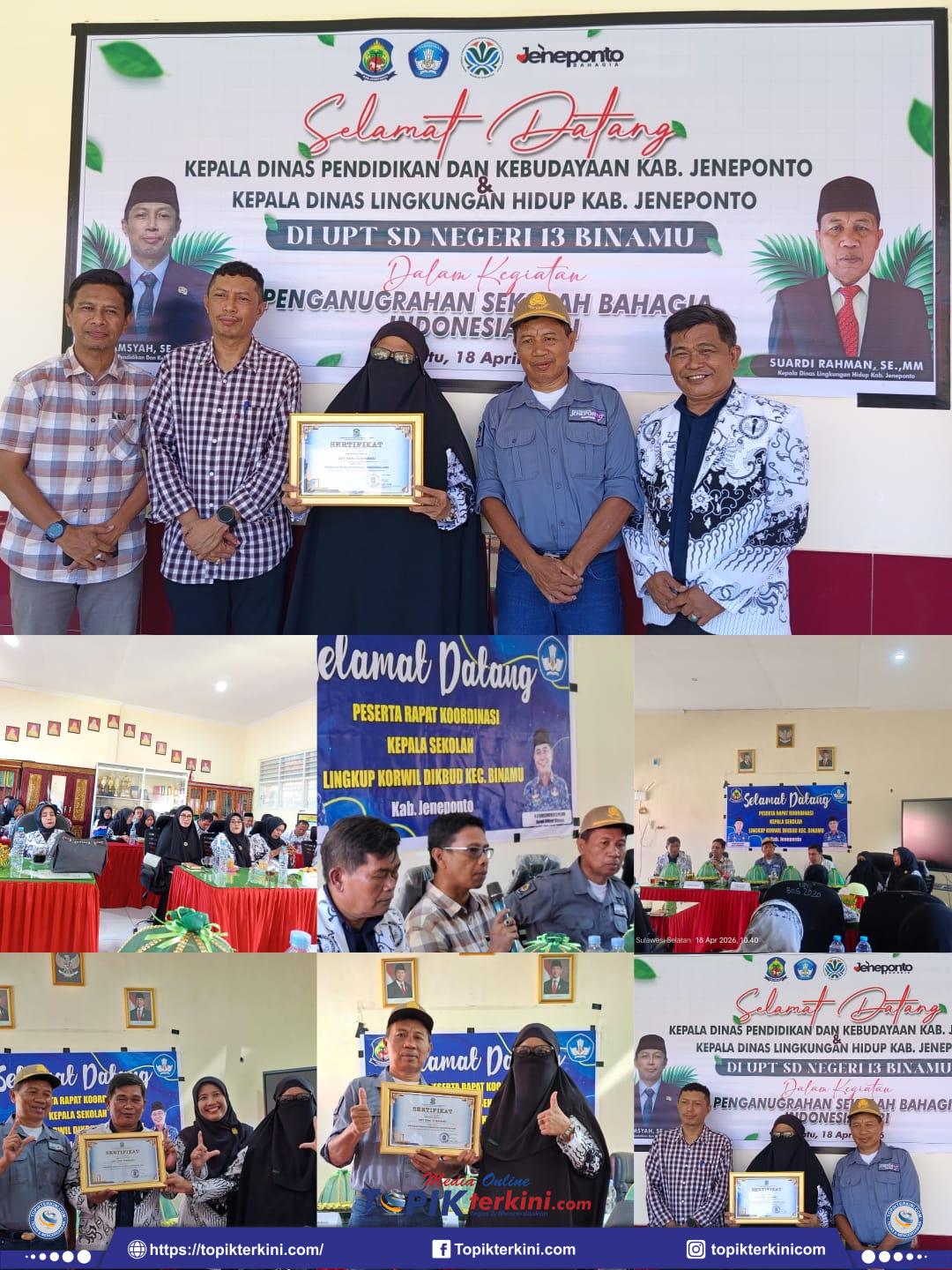 JENEPONTO, topikterkini.com – Sebagai bentuk persembahan istimewa dalam rangka memperingati Hari Jadi Kabupaten Jeneponto yang ke-163 Tahun 2026, Dinas Lingkungan Hidup bekerja sama dengan Dinas Pendidikan dan Kebudayaan Kabupaten Jeneponto menggelar kegiatan penganugerahan sertifikat “Sekolah Bahagia Indonesia Asri”. Kegiatan ini merupakan wujud nyata dukungan terhadap visi Pemerintah Kabupaten Jeneponto “Jeneponto Bahagia” serta Asta Cita Presiden Prabowo Subianto Indonesia Asri.