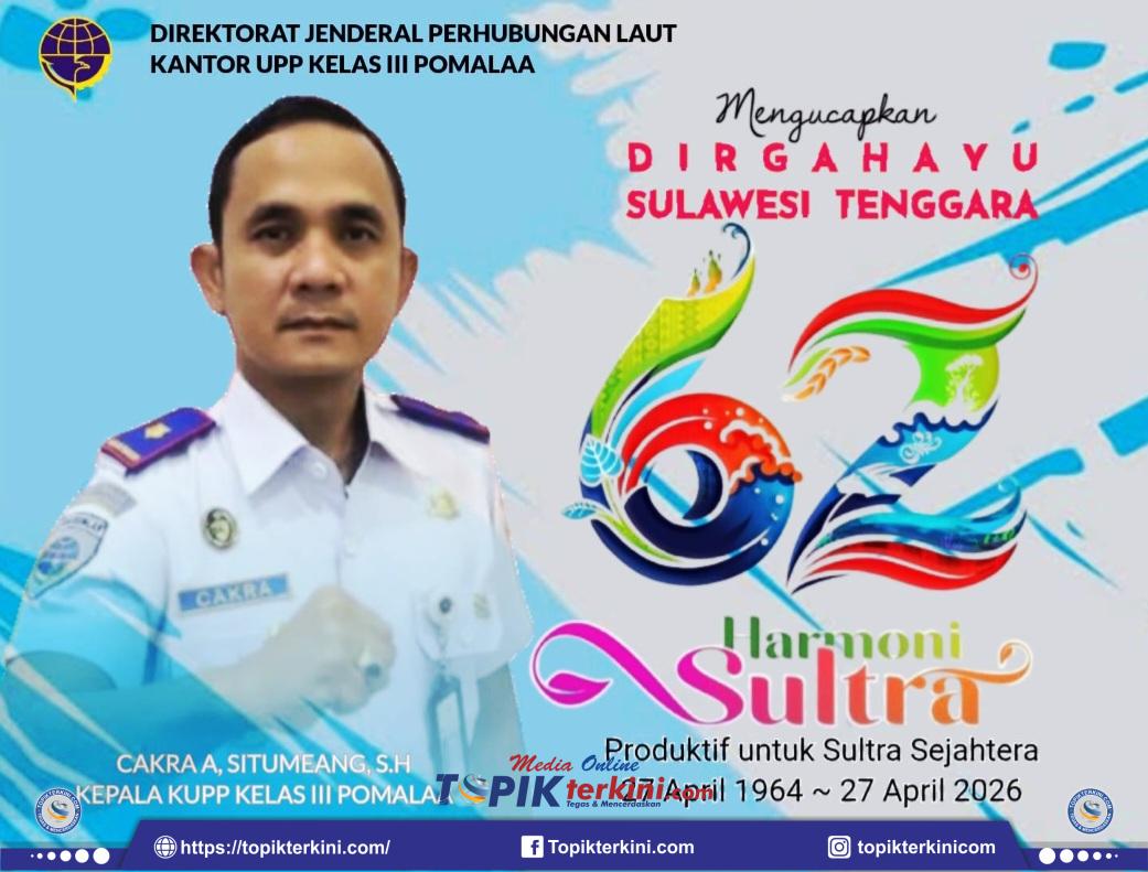 Kepala Kantor Unit Penyeleggara Pelabuhan (KUPP) Kelas III Pomalaa, Cakra A, Situmeang, S.H, mengucapkan Dirgahayu Provinsi Sulawesi Tenggara ke-62. “Terus bergerak, terus berkarya, untuk Sultra yang maju, aman dan sejahtera”.